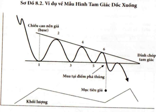 Kỹ thuật đo mục tiêu giá: Giống Tam Giác Dốc Lên → đo chiều cao lớn nhất của tam giác, sau đó trừ khoảng cách đó từ điểm phá vỡ để ước tính mục tiêu giảm.