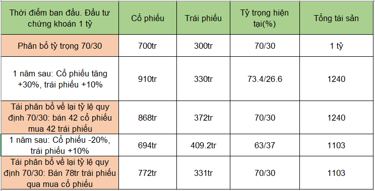 Mình phân bổ tài sản ở kênh đầu tư chứng khoán với tỷ lệ cổ phiếu/trái phiếu là 70/30. (1 tỷ thì 700tr là cổ phiếu và 300tr là trái phiếu). Định kỳ tái cơ cấu hàng năm, hoặc khi tỷ trọng cổ phiếu +-5%.