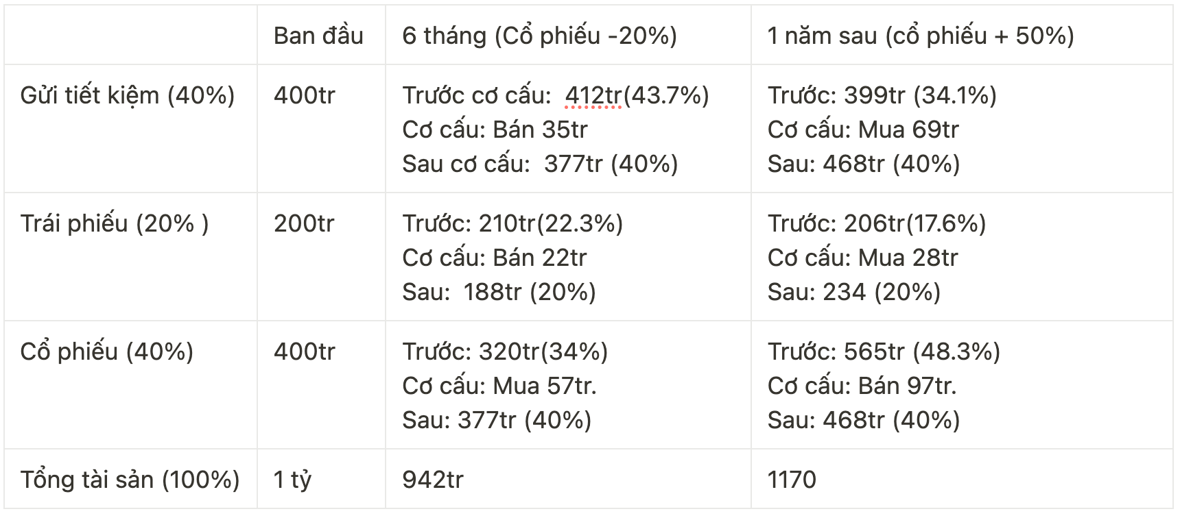12 tháng sau: thị trường chứng khoán thuận lợi, danh mục cổ phiếu tăng 50%, trái phiếu thu về 10%, gửi tiết kiệm thu được 6%. Lúc này lại tái cơ cấu bằng cách bán cổ phiếu tăng mua trái phiếu và gửi tiết kiệm để đem về tỷ trọng tài sản ban đầu.