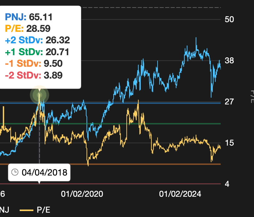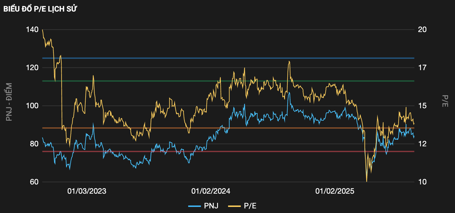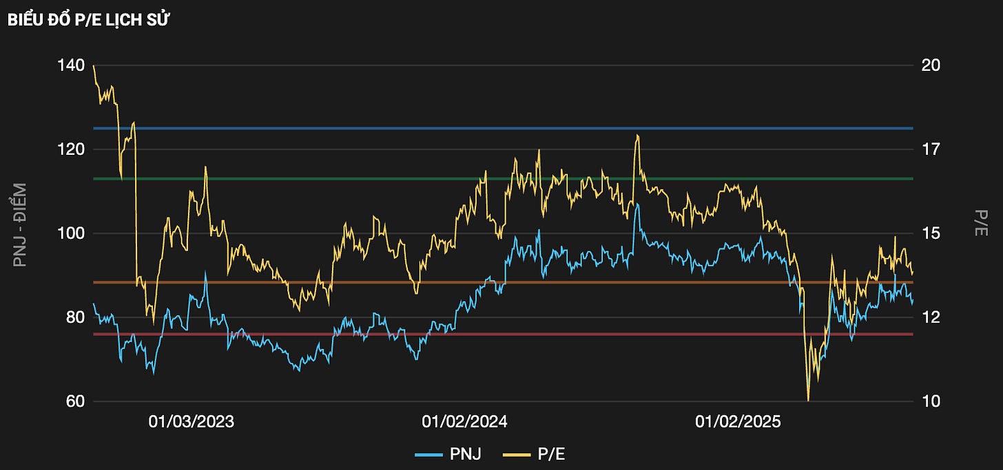 Tại mức vốn hóa 28k tỷ ~ 84.000đ/CP ngày 26/08/2025, PNJ đang được giao dịch tại mức P/E TTM ~13.8 lần nếu chưa loại trừ khen thưởng phúc lợi (~15 lần nếu loại đi KTPL). Đây là mức khá hấp dẫn cho một doanh nghiệp quy mô lớn có tăng trưởng kép CAGR ~ 14% trong 5 năm tới (tham khảo dự phóng của Vietcap)