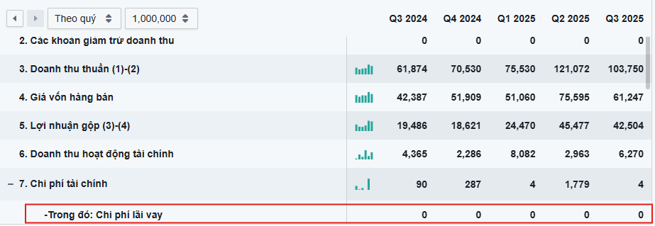 DHA nổi bật nhờ tài chính khỏe, gần như không nợ vay. Doanh thu Q3/2025 đạt 103,7 tỷ (+68% svck) và biên lợi nhuận ròng 32,82%, chủ yếu nhờ sản lượng bán tăng.