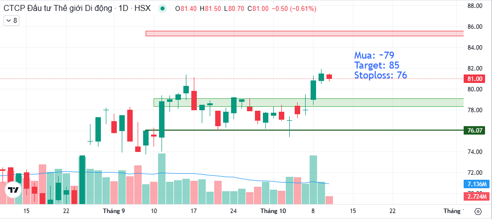 Nhà đầu cơ: Có thể canh mua tại vùng hỗ trợ gần nhất là 79.000đ/cp để tận dụng chu kỳ tin tức thuận lợi của MWG. Mục tiêu kỹ thuật sẽ là 85.000đ/cp và stoploss nếu giá dưới 76.000đ/cp