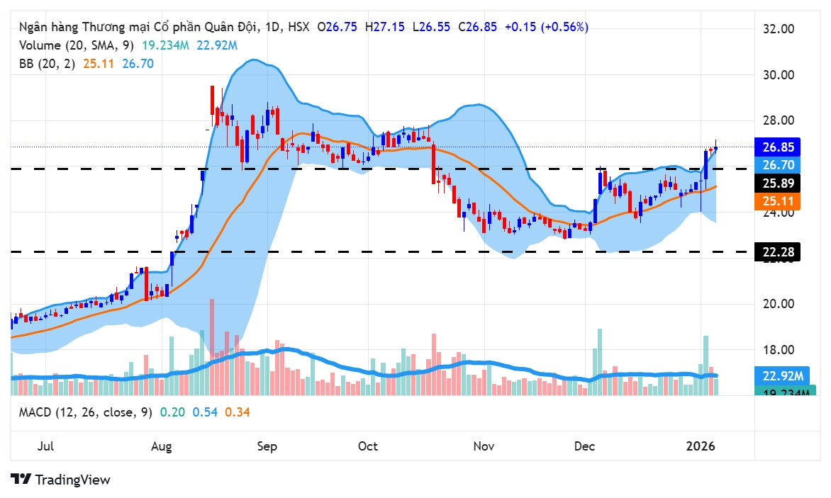 Sau khi tạo đỉnh tại vùng 28,5, MBB từng hình thành nền giá phía trên vùng đỉnh cũ quanh 26–28 nhưng dưới áp lực bán của thị trường chung, cổ phiếu không giữ được nền này và bị thủng, qua đó lùi về vùng hỗ trợ 22–24; tại đây MBB đã tạo một nền giá nhỏ, sau đó nhanh chóng hồi phục và hiện đã vượt qua được vùng kháng cự 26, với hỗ trợ gần nhất tại 26 (nếu thủng 26 thì hỗ trợ tiếp theo là 22,8) và kháng cự gần nhất là đỉnh cũ quanh 28,5.