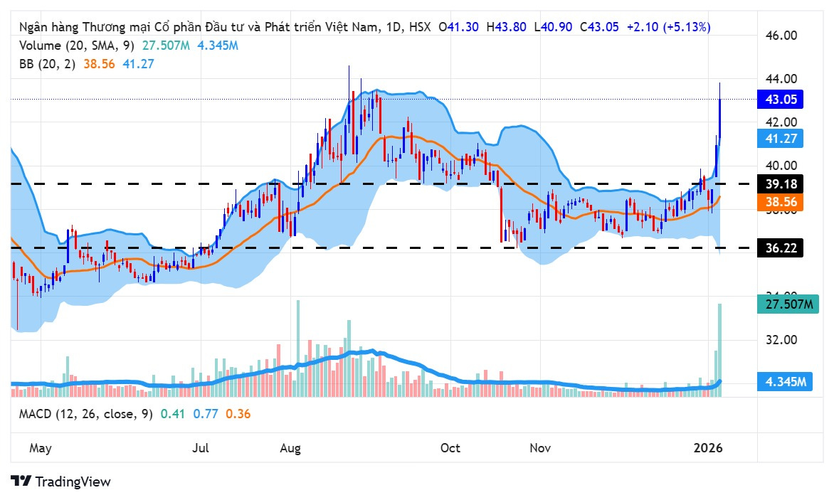 Sau khi tạo đỉnh, BID cũng hình thành một nền giá tích lũy trên cao nhưng sau đó không giữ được và bị thủng nền, khiến cổ phiếu tiếp tục giảm; khi lùi về vùng 36, BID bắt đầu đi ngang với thanh khoản suy giảm rõ rệt, qua đó hình thành nền giá khá chắc chắn trong vùng 36–39, và sau khi vượt qua được kháng cự 39, BID đã tăng tiếp và đang hướng trở lại vùng đỉnh cũ, với hỗ trợ gần nhất tại 39,2 và kháng cự gần nhất là đỉnh cũ quanh 43.
