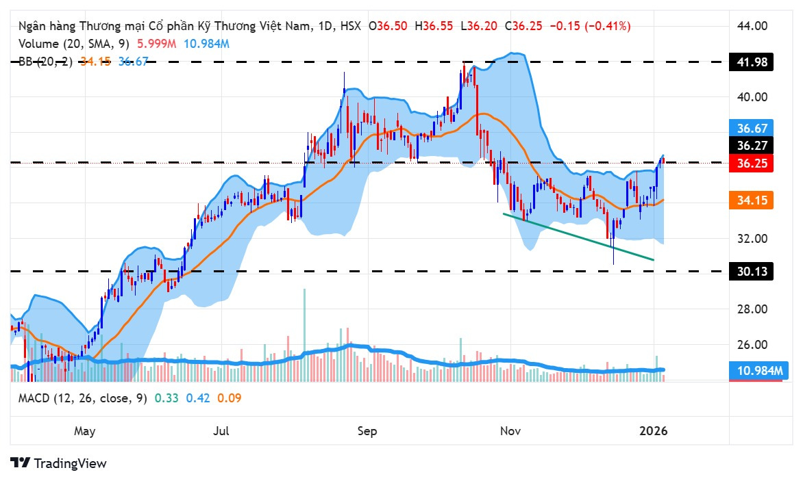 Sau khi tạo đỉnh tại vùng 42 với mẫu hình hai đỉnh, TCB bước vào nhịp điều chỉnh mạnh khoảng 27% từ đỉnh về mức giá thấp nhất quanh 30 và hiện cổ phiếu đã chiết khấu khoảng 13% so với giá hiện tại 36; trong quá trình điều chỉnh, TCB hình thành nền giá tích lũy trong vùng 33–36 và giá đã có dấu hiệu ngừng giảm, với vùng hỗ trợ gần nhất tại 33 (nếu thủng 33 thì hỗ trợ tiếp theo là 30), trong khi kháng cự hiện tại ở 36 và nếu vượt qua được vùng này thì kháng cự kế tiếp là đỉnh cũ quanh 42.