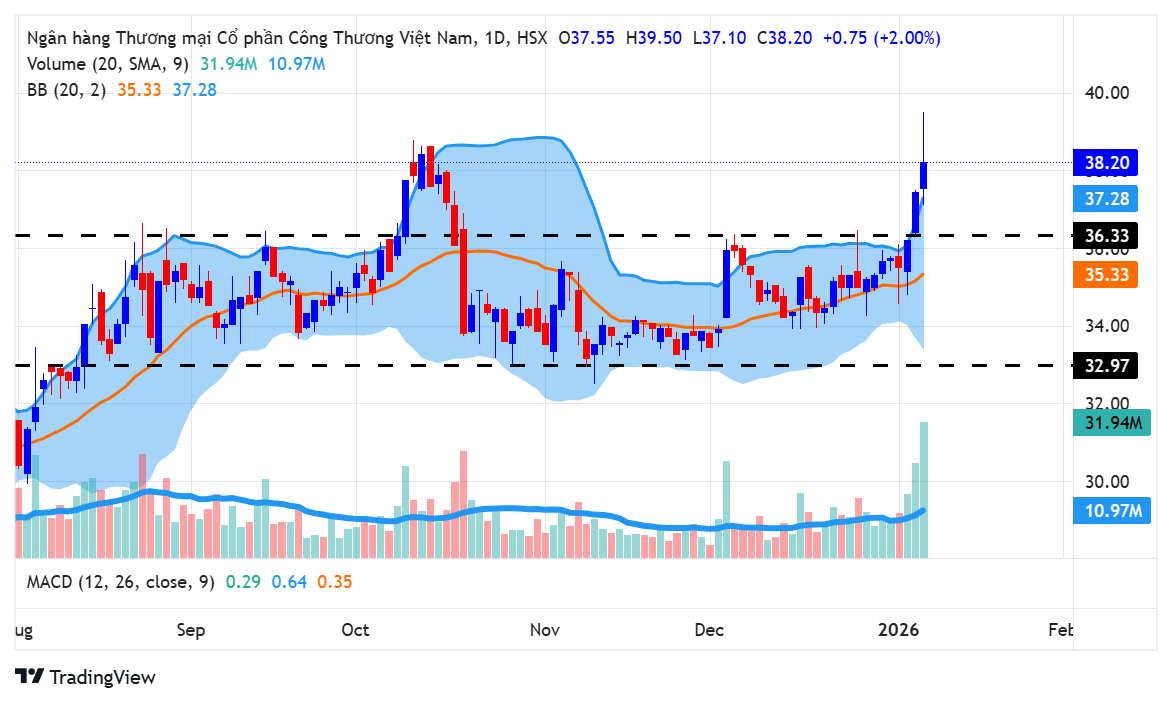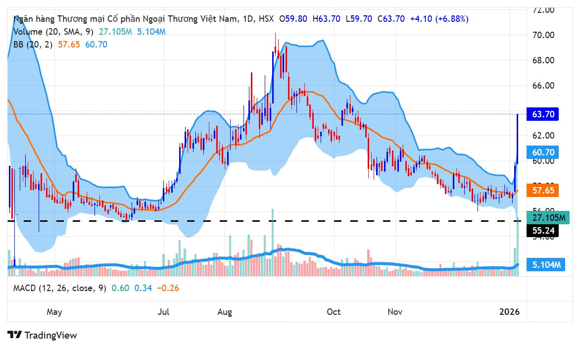 Sau khi tạo đỉnh, VCB giảm một mạch về vùng khởi đầu của nhịp tăng trước đó khi không hình thành nền giá tích lũy trên cao mà liên tục trượt giảm theo biên dưới của Bollinger Bands; tuy nhiên khi giá lùi về quanh 57, cổ phiếu tìm được hỗ trợ từ nền giá hình thành vào tháng 5/2025 và bắt đầu đi ngang, cho thấy đà giảm đã chững lại, và sau khi hoàn tất quá trình tạo đáy, VCB co hẹp Bollinger Bands trở lại, đồng thời phiên tăng điểm tích cực ngày 07/01 đã kích hoạt break lên khỏi Bollinger Bands với MA20 bắt đầu hướng lên; hiện tại, hỗ trợ gần nhất của VCB ở 56 và kháng cự gần nhất là vùng đỉnh cũ quanh 70.
