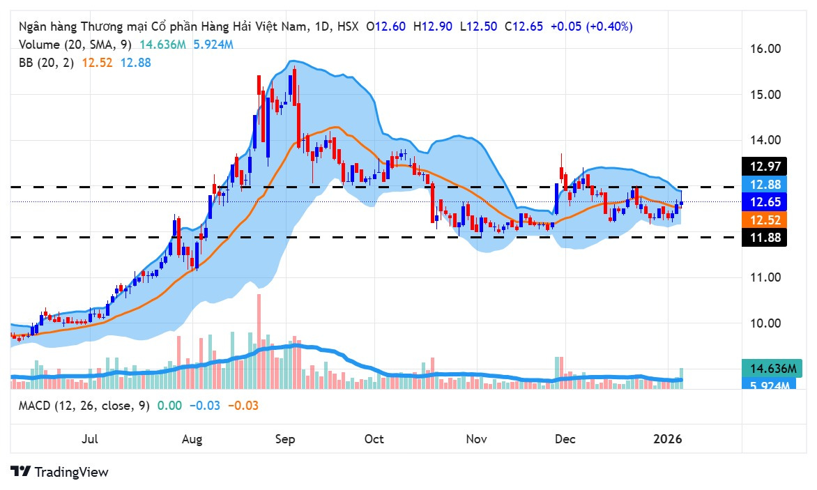 Sau khi tạo đỉnh với mẫu hình hai đỉnh, MSB bước vào nhịp tích lũy nền giá trên cao nhưng dưới áp lực bán của thị trường chung, cổ phiếu không giữ được nền này và tiếp tục bị bán xuống; dù vậy, áp lực bán sau đó không quá lớn và MSB nhanh chóng hình thành một nền giá mới, hiện vẫn đang duy trì trạng thái tích lũy khá tốt trong nền này với thanh khoản thấp, cho thấy cung cổ phiếu đã suy yếu, với vùng hỗ trợ gần nhất tại 12 và kháng cự gần nhất ở 13,7.