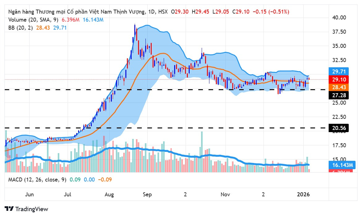 Sau khi tạo đỉnh tại vùng 39, VPB đã giảm khoảng 30% và hiện đang đi ngang, hình thành nền giá tích lũy trong vùng 27–30; đây là nền giá khá chắc chắn khi cổ phiếu đã chiết khấu mạnh 30% và dù thị trường chung có nhiều nhịp giảm điểm nhưng VPB vẫn giữ được nền giá, không để thủng vùng 27, qua đó cho thấy lực cung không còn quá mạnh; hiện tại, vùng hỗ trợ gần nhất của VPB nằm ở 27 và kháng cự gần nhất ở 34,7.
