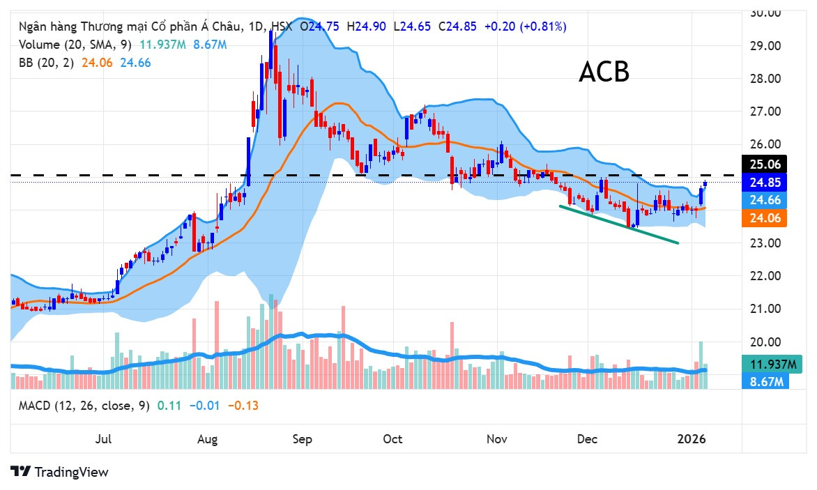 Sau khi tạo đỉnh tại vùng 29–30, ACB bước vào nhịp điều chỉnh và trong quá trình này từng hình thành nền giá quanh 25, tuy nhiên dưới áp lực bán của thị trường chung, cổ phiếu đã bị thủng nền giá này và tiếp tục giảm; điểm tích cực là sau khi mất nền 25, ACB chỉ giảm thêm nhẹ rồi dừng lại và bắt đầu tạo đáy khi áp lực bán suy yếu, xuất hiện các phiên tăng điểm với lực mua quay trở lại, qua đó xác nhận vùng đáy quanh 24, đồng thời đường MA20 không còn dốc xuống mà chuyển sang trạng thái cân bằng và có xu hướng hướng lên; hiện tại, hỗ trợ gần nhất của ACB nằm tại 23,45 và kháng cự gần nhất ở vùng 25.