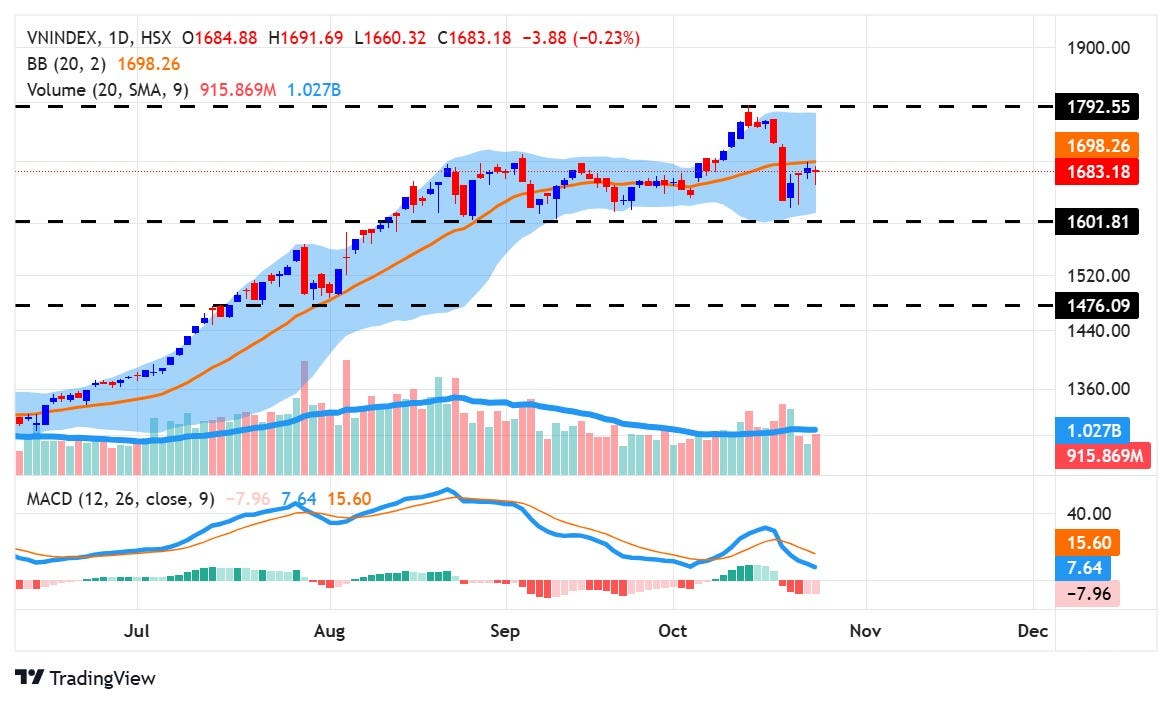 Thị trường sẽ tiếp tục tích lũy trong biên giá 1600–1800 để xây nền giá lại sau khi vượt 1800 thất bại. Trong đó, vùng 1600 được kỳ vọng sẽ giúp VNINDEX hấp thu lực bán trong các đợt rung lắc, thị trường nhìn chung sẽ phải tích lũy một khoảng thời gian trong vùng giá này nếu muốn tăng tiếp và vượt 1800.